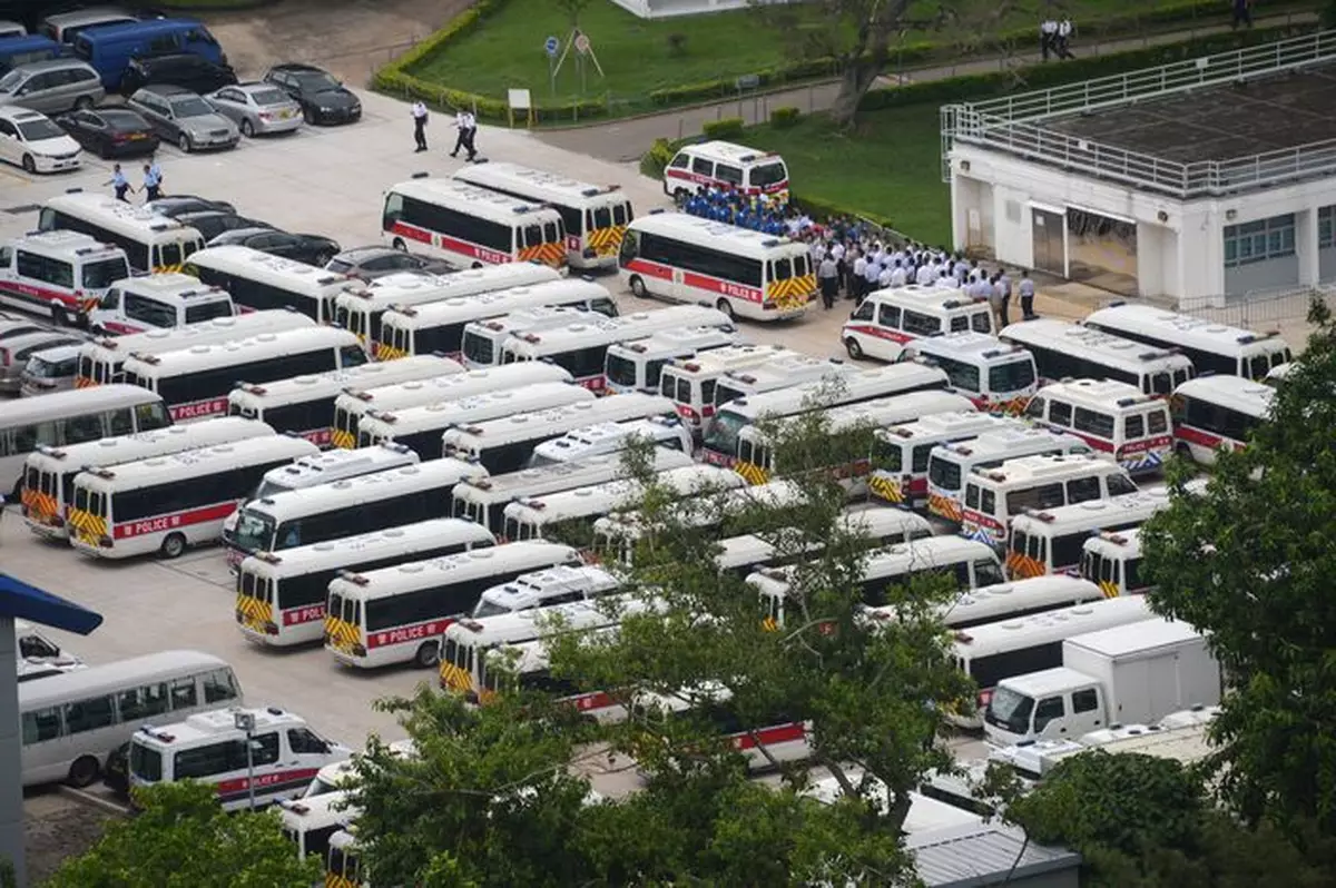 朝早7點幾,大批警員乘坐近50輛警車陸續到達警察學院,各區機動部隊、衝鋒隊及刑偵人員都有參與演練,據悉警方將在「7.1」當日部署超過3200人應對。