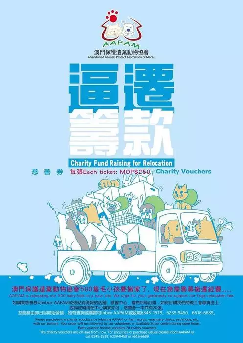 因業主不再續租,澳門保護遺棄動物協會「AAPAM」第四度搬遷,重新選址裝修預算高達200萬元,並需要尋找貓隻庇護中心,急需籌款以支持運作。