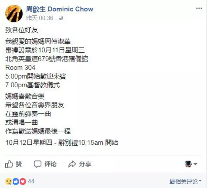 周啟生臉書留言希望各位音樂界朋友在靈前彈奏或清唱一曲,作為歡送媽媽最後一程(網上圖片)
