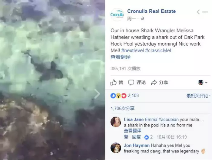 這名女泳客叫梅麗莎(Melissa Hatheier),是一位地產經紀。近日與家人在悉尼附近海灘的泳池游水,一條短尾鯊忽然出現在她們身邊,家人連忙大呼逃命,而梅麗莎面不改色,更大膽地向牠游去。