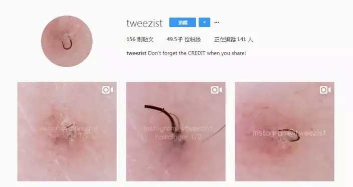 日本賬戶「Tweezist」以近景拍攝拔「毛髮倒生」,與一向大眾所觀看的擠瘡短片性質相同,不少粉絲享受「異物」被取出的一刻,瞬間會覺得非常舒爽及得到治愈。而觀看「拔毛」的粉絲亦一樣從中感到滿足,有粉絲覺得雖然短片令人感到嘔心,但又「唔睇唔得」。
