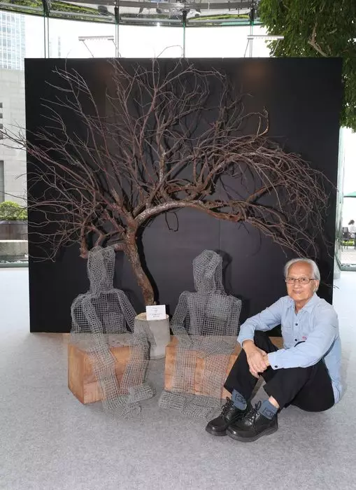 年屆82仍未言休的朱興華,睽違30多年「重聚」參展。他展出以鐵絲網、天然樹和木創作而成的《呆坐着》。作品創作的靈感源自,經過公園時,看見很多老人家坐着休息,不少人更由朝坐到晚,令他有感老人家的生活很孤單寂寞,而這個景象在香港日漸常見,令他有所觸動,但笑言自己還未像他們「呆坐着」。