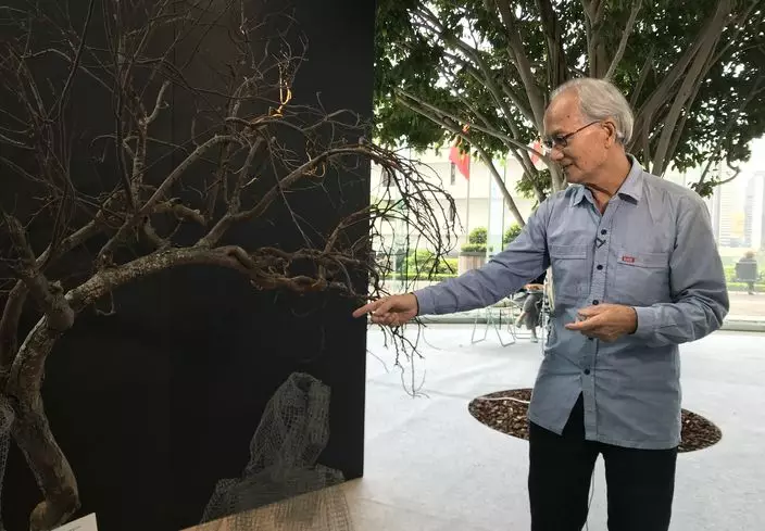 朱興華展出以鐵絲網、天然樹和木創作而成的《呆坐着》。