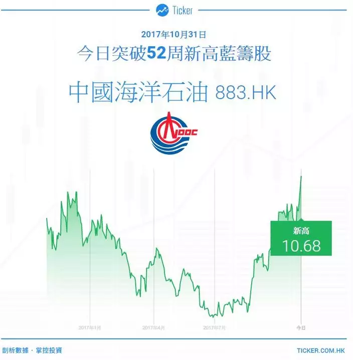 布蘭特期油突破60美元,加上中石油(0883)及中石化業績亮麗,刺激中海油(0883)股價急升,今日更突破52週新高10.68元,全日收報10.62元,升1.34%或0.14元,全日成交額13.56億元。