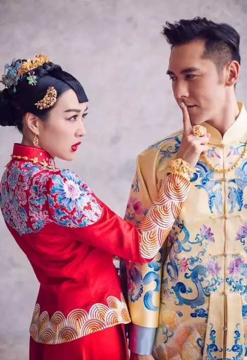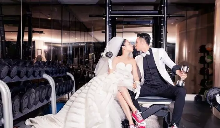 鍾麗緹與張倫碩的中、西式婚照都有搞怪成分,西式婚照在健身室健身;中式婚照就玩挑逗。
