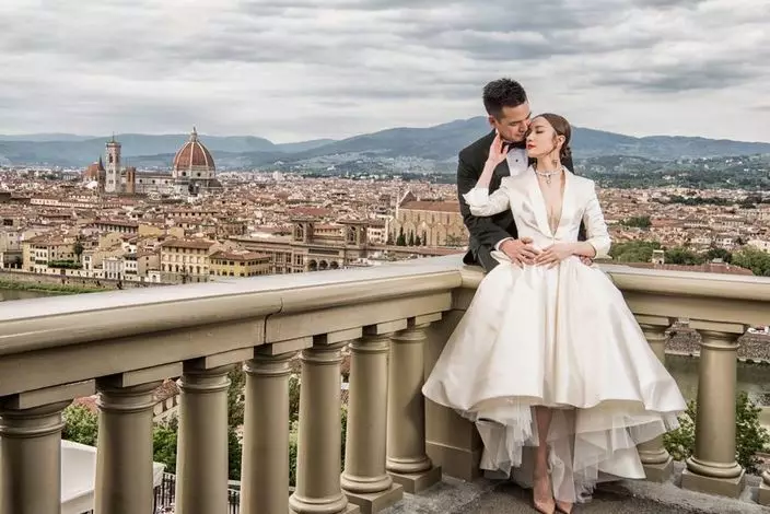 王君馨的婚照在意大利佛羅倫斯和匈牙利布達佩斯拍攝,充滿古典氣息的建築物,配上高貴又帶點性感的禮服,完全實現了君馨喜愛的夢幻風格。