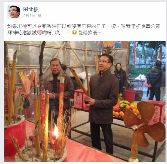 佔中公投及7.1上街後,自由黨田少又發作,好似想郁CY咁款。田少昨日特登在佢自己facebook貼咗年初去拜神照片,仲話:「如果求神可以令到香港同以前沒有思歪的日子一樣,咁我年初喺車公廟拜神時應該誠心啲呀,哎。」