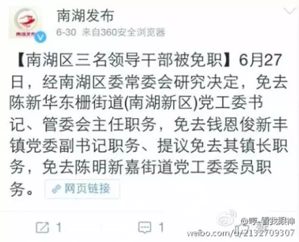 而發文隔日,南湖區委組織部悄悄發佈一份《近期南湖區幹部人事任免》公告,免去多人的職務,而事件中三人的名未同樣在公告內。而南湖區委宣傳部證實,三人因該文章而被免職,但是否屬實仍需調查,但對社會造成不良影響。