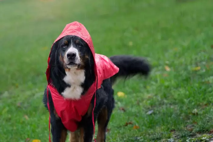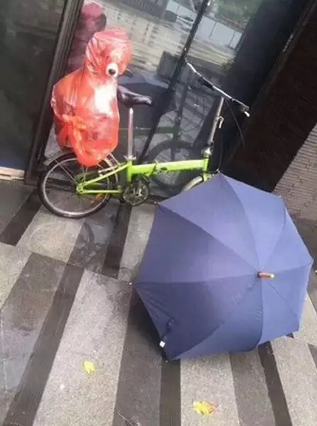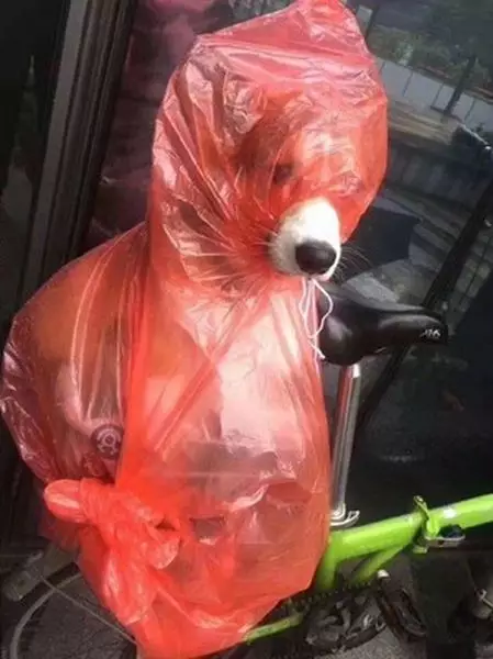 下雨天要帶毛孩出門,又不想牠淋濕身,不少主人都為為狗狗穿雨衣。近日網上流傳一張用膠雨衣包住狗狗的照片,引起網友熱議。