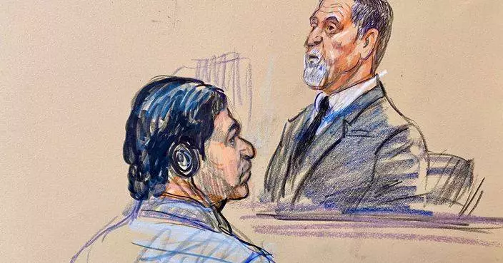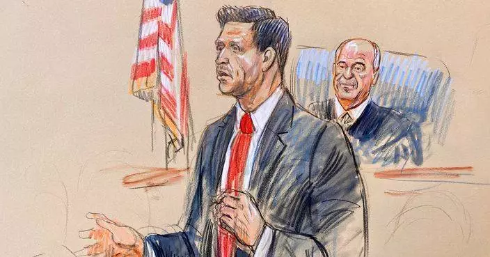 (美聯社圖片/Dana Verkouteren) 法庭素描顯示,辯方律師卡門斯(Geremy Kamens)在維珍尼亞州亞歷山德里亞(Alexandria)聯邦法院,為被指控為「伊斯蘭國」武裝分子的穆罕默德沙里夫拉(Mohammad Sharifullah)開審首日發言,法官特倫加(Anthony J. Trenga)在旁聆聽。攝於2026年4月20日周一。 AP圖片
