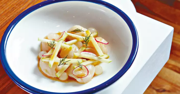 餐廳主打傳統風味菜式,即吃西班牙海鮮的鮮味。Scallop Crudo選用北海道帶子,面層擺放青蘋果絲和小蘿蔔片,酸甜清爽。