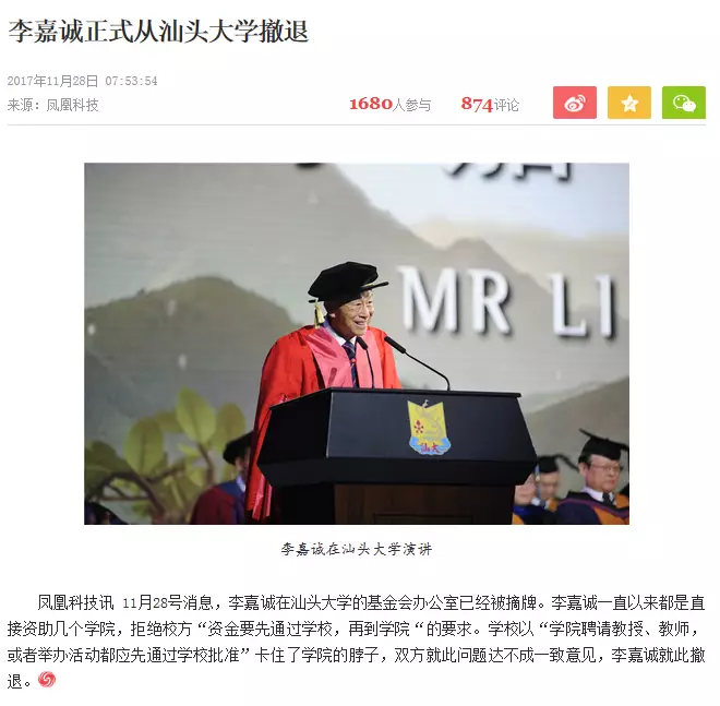 鳳凰網昨早8時發出「李嘉誠從汕頭大學撤退基金會辦公室被摘牌」文章,內文引述凰科技訊消息,指「李嘉誠在汕頭大學的基金會辦公室已經被摘牌。李嘉誠一直以來都是直接資助幾個學院,拒絕校方“資金要先通過學校,再到學院“的要求。學校以“學院聘請教授、教師,或者舉辦活動都應先通過學校批准”卡住了學院的脖子,雙方就此問題達不成一致意見,李嘉誠就此撤退。」