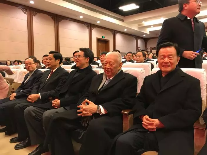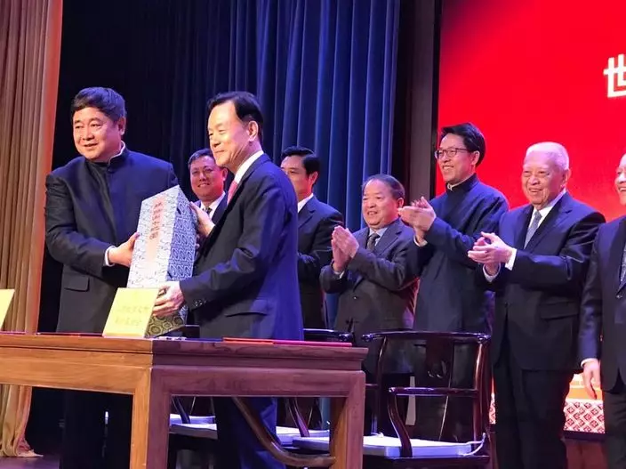 許榮茂(前排左2)向故宮捐贈《絲路山水地圖》,全國政協副主席董建華(後排右2)、港澳辦主任張曉明(後排右3)等出席儀式。