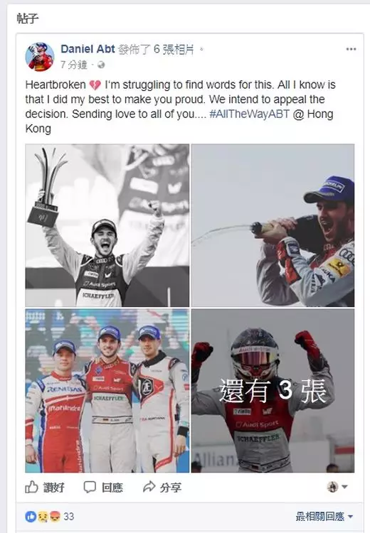 今日比賽冠軍原本由奧迪車隊的德國車手阿比徹奪得。但賽會其後宣布,阿比徹被撤銷資格。阿比徹今日適逢生日,在社交網站表示,「對結果感到心碎,難以用言語形容感受,但我知道我已盡力令大家感到自豪,會就裁決上訴。」
