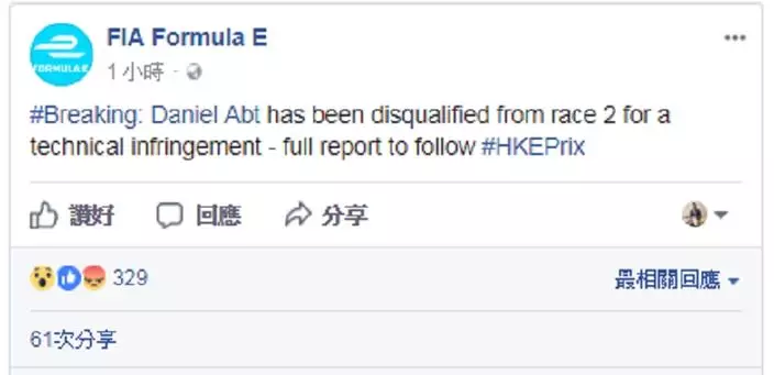 電動方程式賽車錦標賽,賽會在社交網站公布,撤銷德國車手阿比徹的冠軍資格。