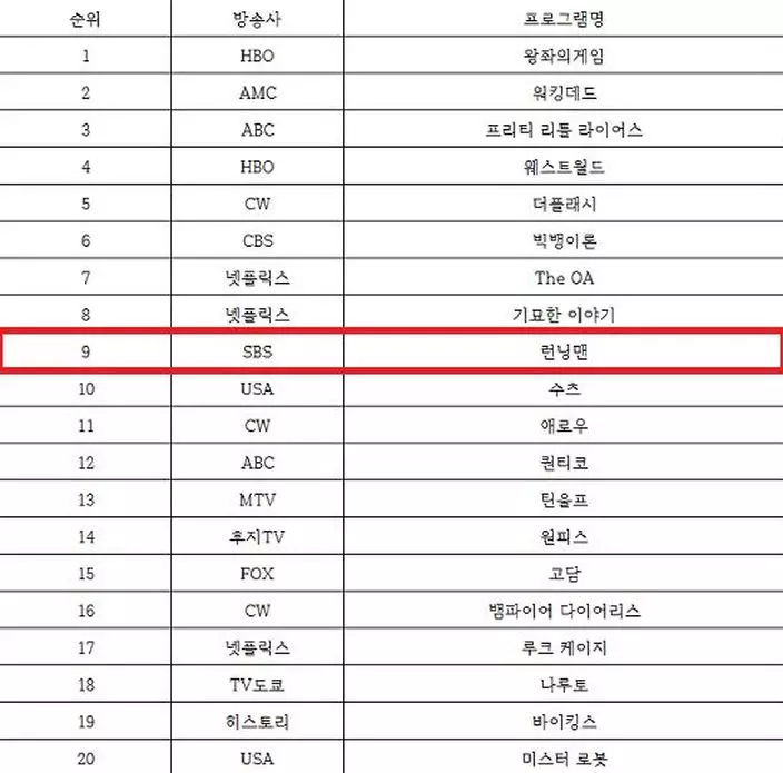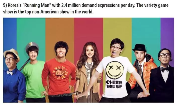 根據美國新聞網Business Insider的數據,全球首20位最受歡迎的電視節目,在一列盡是美國節目排行榜中,唯獨《Running Man》佔據了第9位:「韓國節目《Running Man》每天有240萬人觀看。這個綜藝節目是唯一上榜的非美國製作節目。」