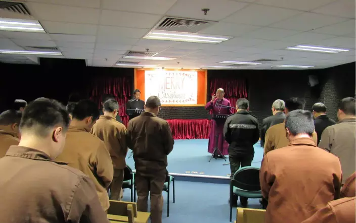 聖公會大主教鄺保羅在本月21日到白沙灣懲教所主持聖誕崇拜。懲教署圖片