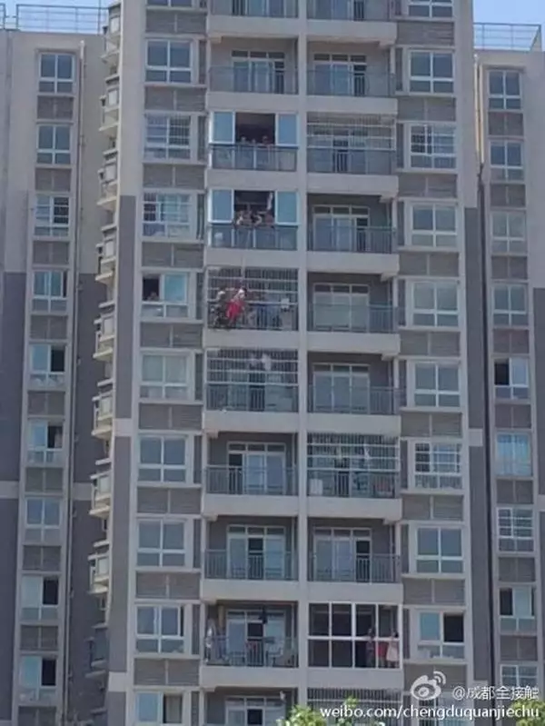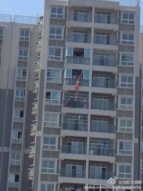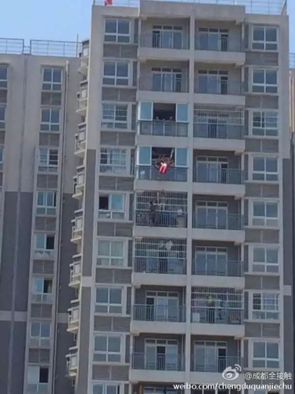 有人在微博發貼,指昨日下午約一時,該名住在成都武侯區的一個屋苑的女人,疑與家人爭執,突然從12樓的家中一躍而下。樓下住戶發現女子尋死,在千鈞一髮間一把抓住女子的腳腕。街坊見到女人懸掛在大廈外牆,急忙報警,最後在消防員協助下,成功將女子拉回單位內。