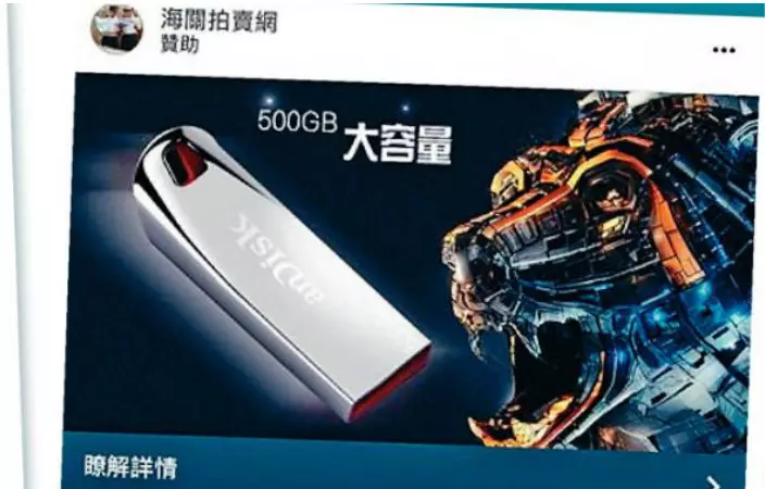 以「海關拍賣網」為例,出售「anDisk」品牌的512GB USB手指,其商標和銀紅色設計疑似影射美國某著名快閃記憶體品牌,實來源不明。專頁指產品因港美雙方進入貿易溝通期,被扣關逾一個月,年尾海關倉庫壓力過大,經協商後決定緊急出售該批USB手指,由原價一千五百五十元減至二百九十九元。網頁顯示已售出逾千件產品,又貼上一幅海關行動照片。另一專頁與「海關拍賣網」相似,但所售512GB USB手指無標明品牌,並改稱貨物不符合國家進出口條例,暫不允許出口販賣而被扣關。