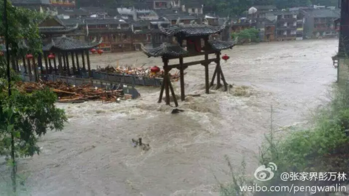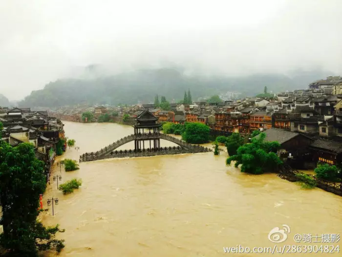 洪水滾滾,鳳凰知名景點虹橋的橋身受到衝擊,一座木質結構的「風雨橋」也被沖垮。據介紹,該座「風雨橋」是由著名畫家黃永玉設計和捐資興建,用於民眾和遊客休閒觀光。