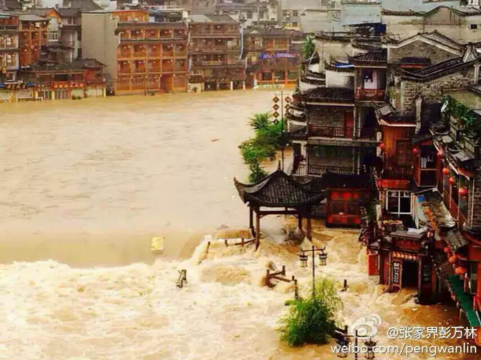 繼上月受「端午洪水」襲擊後,湖南湘西鳳凰古城昨天遭遇有記錄以來最大洪水,全城水浸停電,包括旅客在內的十二萬人要緊急轉移,景區臨時關閉。古城一座由著名畫家黃永玉設計、捐建的「風雨橋」終不敵風雨,被滾滾洪水徹底沖毀。