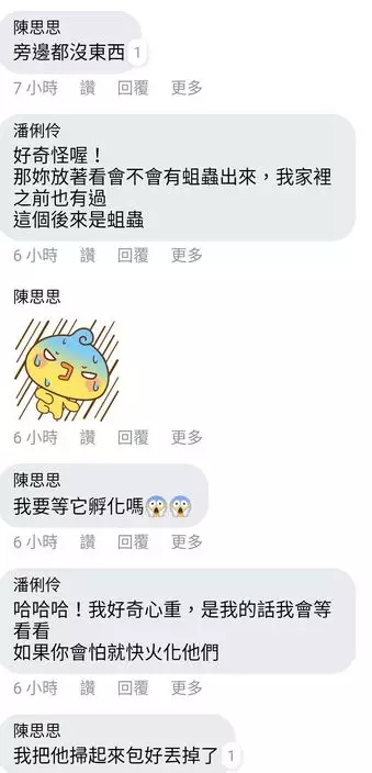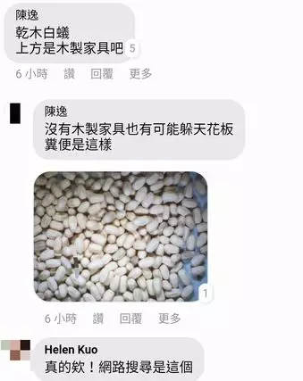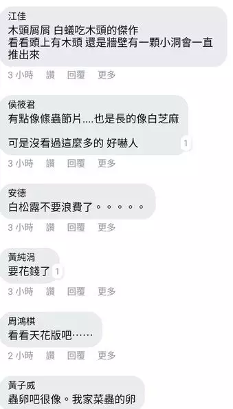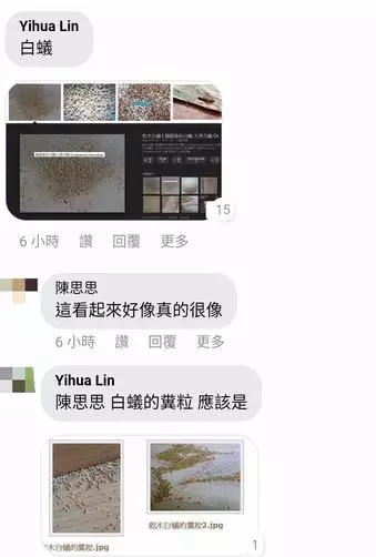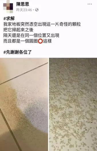台灣一位網友於家中地板上發現很多白色的粒狀物體,掃清後隔天又出現於相同位置,感到十分奇怪。由於網友未知白色粒狀物為何物,於是拍下照片詢問網友意見。不少網友認為白色粒狀物為蛀蟲或白蟻,也有網友覺得是白蟻的糞便或是蟲的卵。