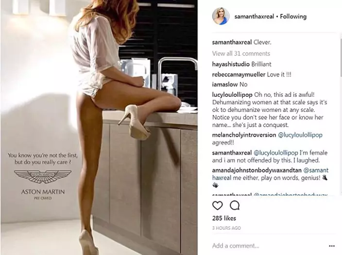 此言一出,不少網友都認為Samantha說得很在理,大家都深有同感。不過,Samantha的言論也時常引發爭議,就如此前她分享了一張知名汽車品牌的廣告圖,並發文表示廣告設計師很「機智有才」,然而有網友卻認為這個廣告暗含性歧視的意味,引發兩派爭論。