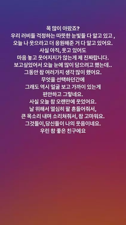 Yeri事後在Instagram感謝粉絲:「ReVeluv(Red Velvet粉絲名)的嗓子都很痛吧?我們ReVeluv因為擔心而傳來的溫暖眼神我都知道,今天為了讓我笑,更努力地應援了我也知道。其實至今為止,即使笑著,心裏仍有放不下的事實,一直想找機會與粉絲見面。這段時間也思考了很多,今天選擇選擇來看ReVeluv的樣子。今天見到ReVeluv,心情平穩了很多。今天是我時隔很久再笑了。感謝你們為了我揮動著雙手,又大聲地為我打氣。你們做的,你們每一位,都是我快樂的來源。我們是很好的朋友啊。」
