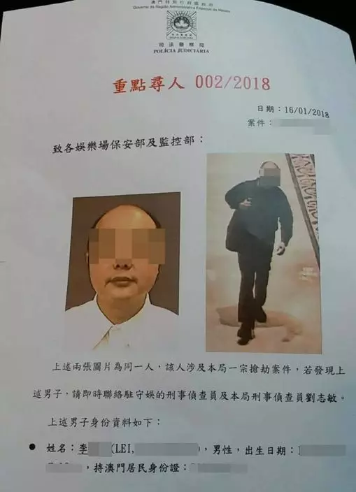 消息指,事發在昨日早上6時許,一名49歲姓李的荷官,疑將利刀藏於鞋底,成功避開賭場安檢並進入貴賓廳,其後趁交更時間持刀指嚇在場人士,將大量籌碼放入事前準備的環保袋內,得手後換上便服逃去。 事發後網上流傳疑犯的通緝照片,澳門司警正調查事件,並追緝其行蹤。