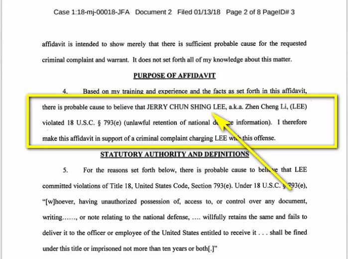 53歲的李振成於周一抵達紐約甘迺迪國際機場後被拘留,並被控保留機密信息一項罪名。這項指控的最高刑期是10年。