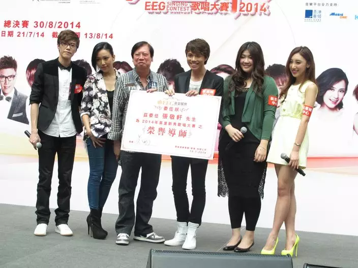 英皇娛樂高層吳雨、張敬軒及鍾舒漫等,昨日出席新秀歌唱大賽記者會,軒仔即場獲委任為榮譽導師。