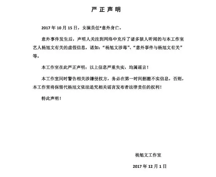兩個月後警方調查結果認為任嬌當時是因醉酒而一時失足,墜樓純屬意外,楊旭文也透過工作室發表嚴正聲明,指所有傳言「嚴重失實,均屬謠言!」要求網民刪除留言,否則依法追究。
