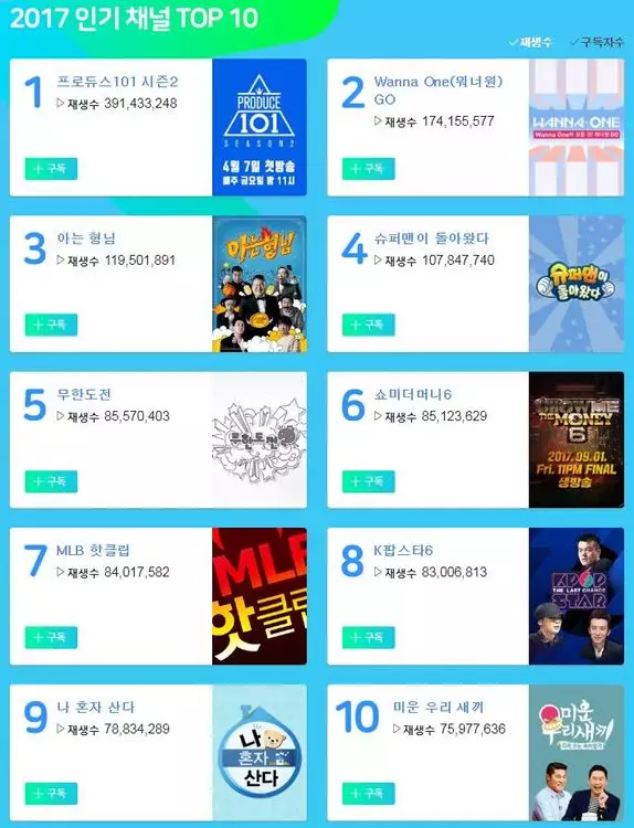 另外,Naver TV同時公布了「2017年人氣頻道」,《Produce 101》第二季毫無懸念地取下了一位,第二位有Wanna One的專屬團體綜藝《Wanna One Go》,而第三位則有綜藝節目《認識的哥哥》。