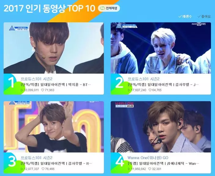 上年4月開始,稍微有留意韓國消息的網友,都不難被《Produce 101》第二季的各種消息洗版,可見該節目的討論度在韓國海内外都同樣驚人。而根據Naver TV公布的「2017年人氣影片」Top 10,更全都是「101男孩」的身影!