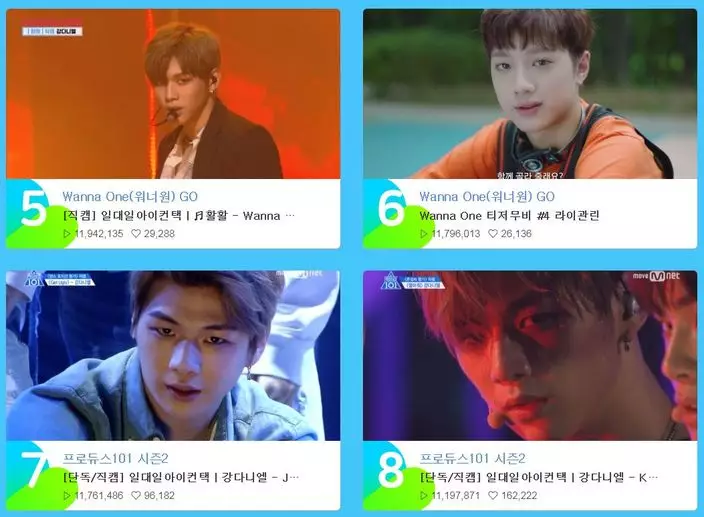 「2017年人氣影片」的第一位由Wanna One的朴志訓奪得,而Kim Samuel取下了二、三位,兩人奪得如此多瀏覽數的影片都是《Produce 101》第二季表演的個人直拍。而Wanna One的Centre姜丹尼爾則包攬了四、五,及七至十位,賴冠霖則是奪下第六位,可見姜Centre的人氣真的超級驚人!