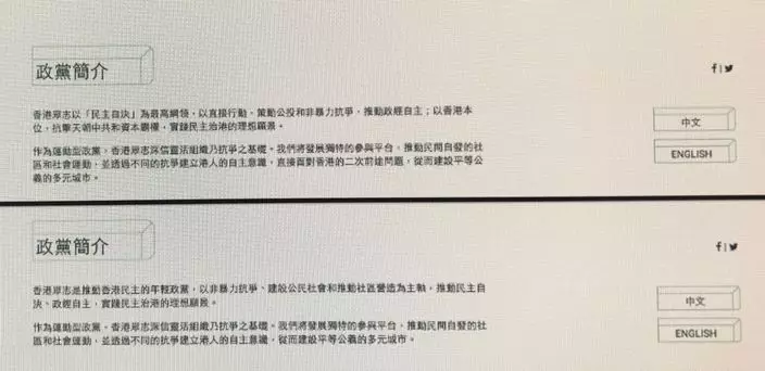 圖:香港眾志舊版(上)和新版(下)綱領比較