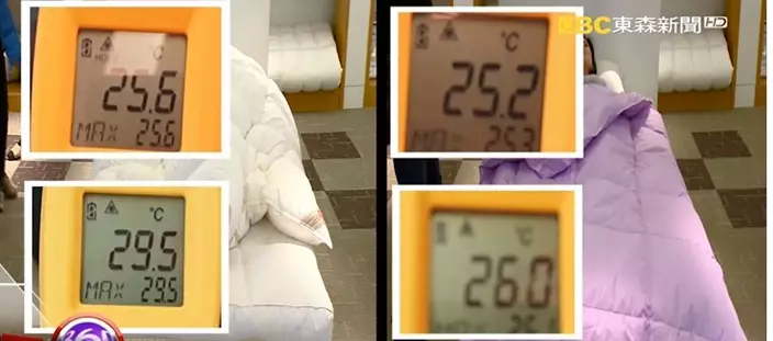 羽絲與真正的羽絨有很大分別,直接影響保暖度。以溫度作為測試,將被子蓋上五分鐘左右,真正的羽絨被可以令溫度由25.6度升至29.5度,升溫約4度;而羽絲絨被卻只能由25.2度升至26度,不足1度。