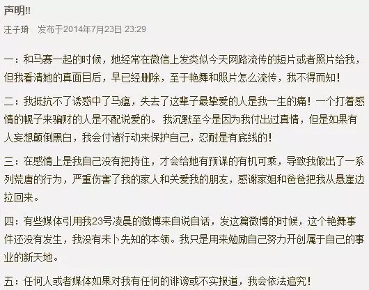 馬賽穿性趣內衣跳豔舞影片流出後,昨晚以個人名義名表聲明默認片中人就是自己,又大呻「愛錯了」。曾與賽賽傳出斷背情的內地制片人汪子琦被疑為幕後黑手,汪子琦也在昨晚上11點半左右發聲明反擊。