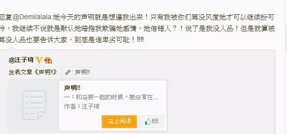 汪子琦話,自己愛錯人「中了馬瘟」,斥馬賽「一個打著感情的幌子來騙財的人是不配說愛的。在聲明中又透露因為抵擋不了誘惑愛上馬賽以至於「失去了這輩子最摯愛的人」,明指馬賽為「第三者」。