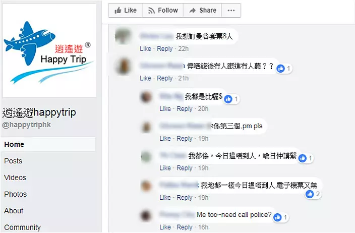 「逍遙遊」社交專頁三日前,即上周五仍有人回應有關查價的提問,但之後開始沒人回覆,隨之而來是一群苦主投訴,付錢後沒人跟進,群起報警。但有苦主在網上表示現階段只能備案,因為旅行團未出發,未能有跟進。