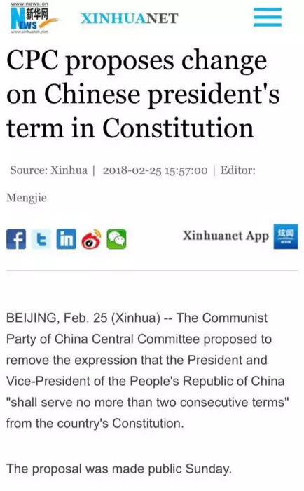中共中央昨天建議國家修改憲法,刪定國家主席任期不得超過兩屆的規定,外界一般相信現任國家主席習近平在2023年完成兩屆國家主席任期後,很大機會再續任第三屆。