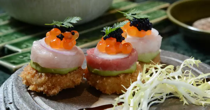 非一般料理,怎會只有一款?迷你可愛的「脆壽司漢堡」,最底一層並非肉餅,而是以日本零食柿之種米果造成麵包糠,再包着脆米餅,加上牛油果、油甘魚、吞拿魚、洋蔥和魚子,一啖吃來極富層次,佐酒一流。這道美食亦顯示總廚童心未泯的一面,是他獨家菜式。