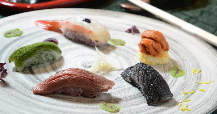 「五色手握壽司」以五種顏色呈上,鹿兒島A5和牛配上加入紅酒的壽司飯,海膽壽司就用上加入雞蛋和黃蘿蔔的壽司飯,顏色來自食材天然色素,壽司質素不錯,加上賣相精緻,生色不少。