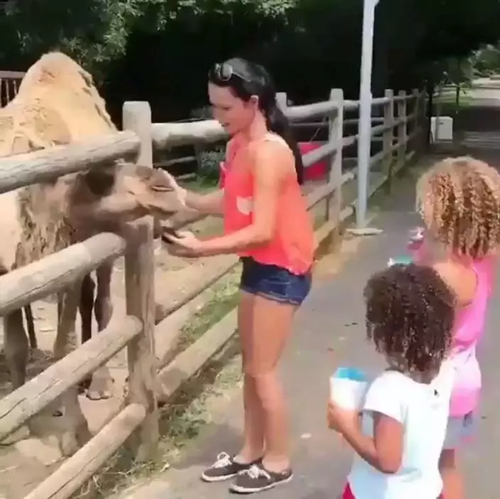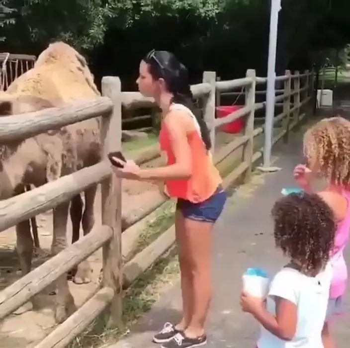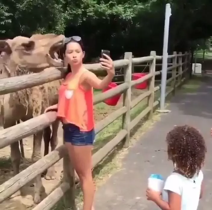 網上近日瘋一則影片,可見一位身穿橙色小背心的女遊客,想與駱駝自拍,駱駝似乎不太願意,所以先躲開,但女遊客仍不死心,準備直接舉機拍攝,結果駱駝發怒,即張開嘴巴想要咬女遊客的頭,幸好女遊客反應快,順利逃出「駝」口,否則不堪設想。
