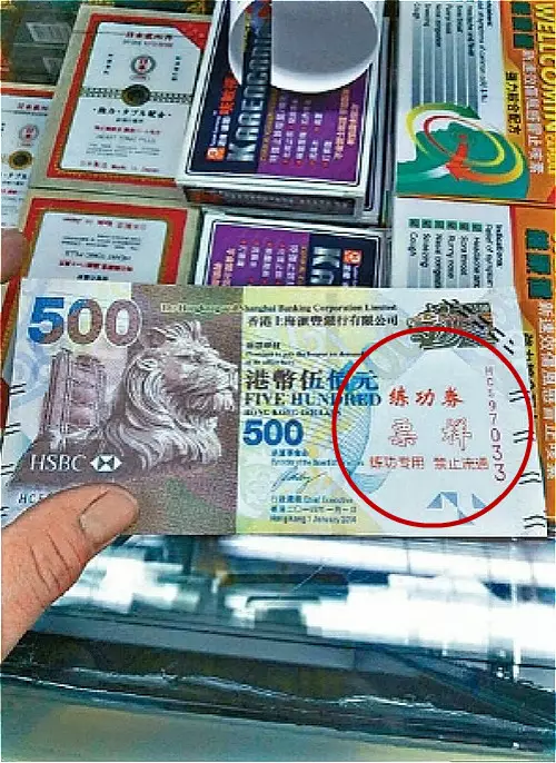 近日多個社交平台及WhatsApp群組瘋傳一段訊息,稱有市民在觀塘樂華邨收到一疊500港元現金,詎料當中部份竟印有「練功券」字樣,其中一張編號為HC597033。有關訊息的圖片背景有一批成藥,記者推測收券的地點為藥房,昨天往樂華邨查證時,藥房、商戶和街坊均表示不知情。