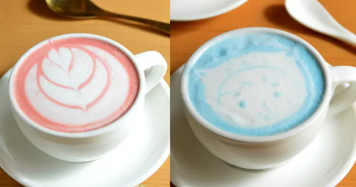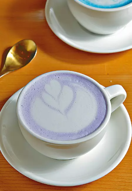 「加入不同顏色後,感覺較歡樂!」除了竹炭咖啡外,還有非咖啡類的紫芋拿鐵、藍橙拿鐵和紅絲絨拿鐵。「全用天然色素,紅絲絨是紅菜頭粉加可力粉、紫芋拿鐵就是芋頭粉。」飲品看起來賞心悅目,頓時趕走心中煩悶。