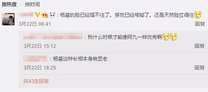 在完全沒有美肌功能協助下的楊冪,不但現出超深的法令紋,連眼下的淚溝亦深得嚇人,或是因為自知法令紋太深,她全晚每次露出笑容時,也會以手遮掩。網友們看到了楊冪的「真面目」後,都驚呼「臉好像要垮了!」亦有人翻出她去年在節目上素顏的截圖,發現當時的皮膚狀況看上好很多,認為她現時的變化主要是由消瘦引起,臉頰沒肉才會顯出老態。