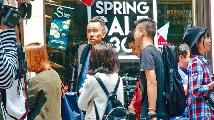 「接頭大哥」披着西裝外套,等候期間頻頻低頭查看手機,神情緊張,又與同行男女交頭接耳,不時東張西望,當發現有記者在現場採訪拍攝,即離開人龍,躲到角落逃避鏡頭,並戴上口罩。至開售後,有人帶同四名男女購票,但發現記者追蹤即「快閃」。