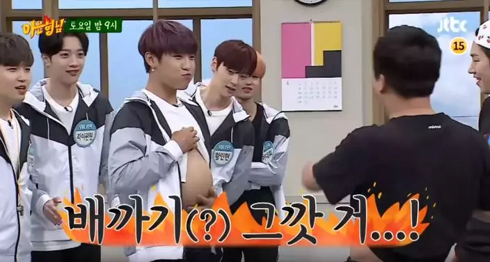 但最觸目的,就是當主持李壽根掀起衣服露出了自己的圓肚,想不到朴佑鎮也露出自己的「籃球肚」,平日在舞台上露出的腹肌完全消失不見,讓粉絲都十分震驚。