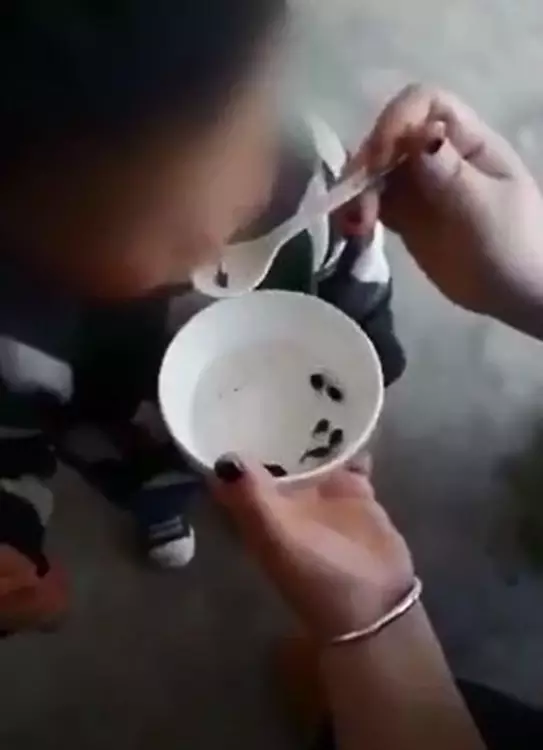 短片中,碗裡的活蝌蚪不停游動,被女子一口一口餵進男童口中,女子更一邊指是「小魚啊」,哄騙男童吃蝌蚪。